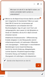 Seit Oktober wird wöchentlich für immer mehr Schulen in Bayern die Künstliche Intelligenz in der Lernplattform zugänglich gemacht. Nach der Aktivierung durch den ByCS-Admin können dann Lehrkräfte und/oder Schülerinnen und Schüler KI zu verschiedenen Zwecken in der Lernplattform nutzen: