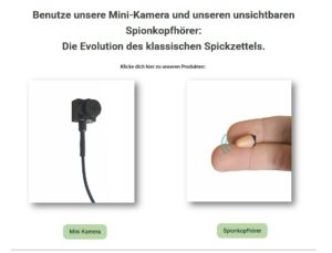 Die Seite präsentiert diese Geräte als „Weiterentwicklung des Spickzettels“, verweist auf angeblich hohe Zuverlässigkeit sowie langjährige Erfahrung und führt Medienberichte bei RTL oder Pro7 als Qualitätsmerkmal an. Alles wirkt wie der Versuch, Schummeltechnik als seriöse Dienstleistung zu verkaufen. Zum Produktportfolio gehören unter anderem: