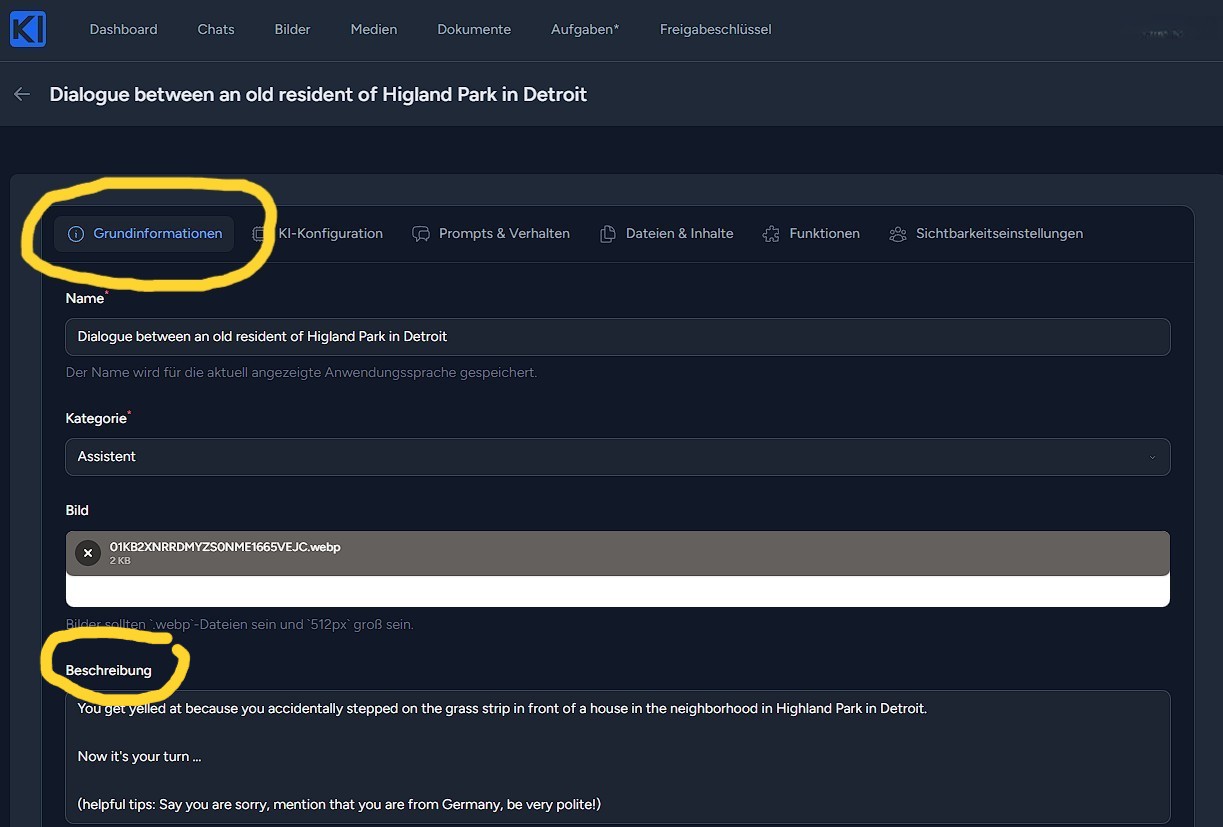 In der SchulKI wird ein neuer Assistent angelegt, indem Sie die Grundinformationen wie Name und Beschreibung eingeben. Weitere technische Einstellungen, z. B. die Wahl des Sprachmodells, können vorgenommen werden, sind aber optional - die Standardeinstellungen sind hier voll ausreichend. In der Beschreibung ist es besonders sinnvoll, den genauen Arbeitsauftrag und einen Gesprächsbeginn zu hinterlegen, um den Einstieg in die Interaktion bei der Nutzung des Bots zu erleichtern.
