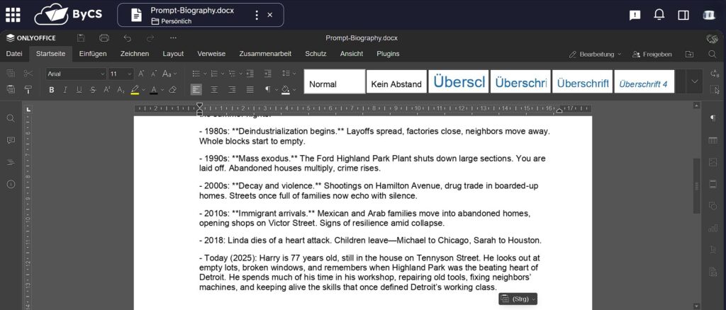 Die Arbeit erfolgt direkt in freigegebenen Dokumenten innerhalb der ByCS-Office-Umgebung. Die Prompts sollen im Fremdsprachenunterricht direkt in der Fremdsprache verfasst werden, um den sprachlichen Lernaspekt zu stärken. Hierbei kann die KI unterstützend eingesetzt werden, etwa zur Überprüfung von Formulierungen oder für Übersetzungsvorschläge.