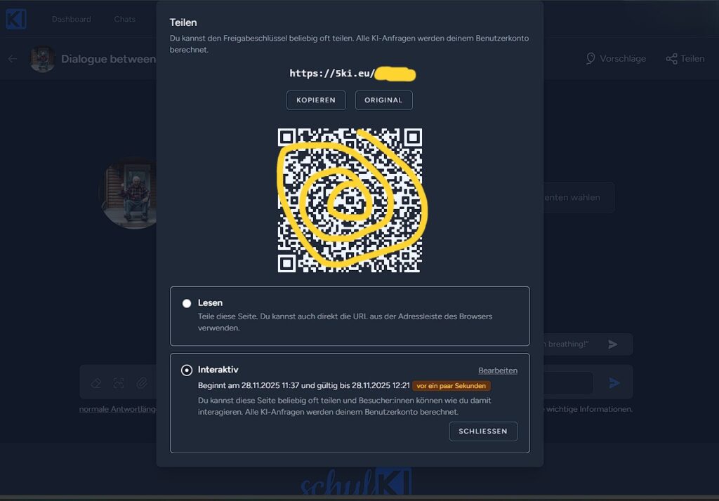 Beispiel für einen SchulKI-Freigabelink für einen Assistenten. Wichtig: Der Freigabelink muss auf interaktiv eingestellt sein!