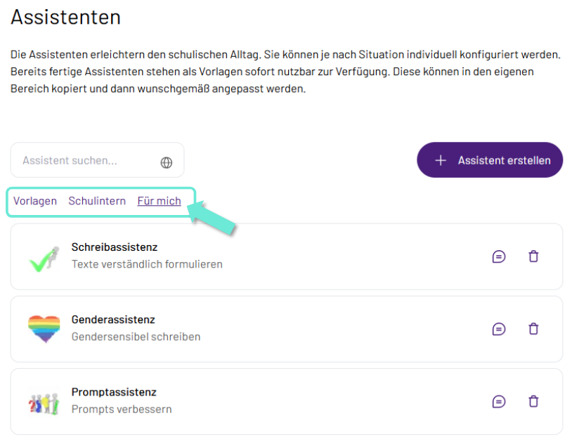 Alle Angebote lassen sich dabei schulweit teilen, so können z.B. auch von Fachschaftsleitern oder der Schulleitung Assistenten bereit gestellt werden.