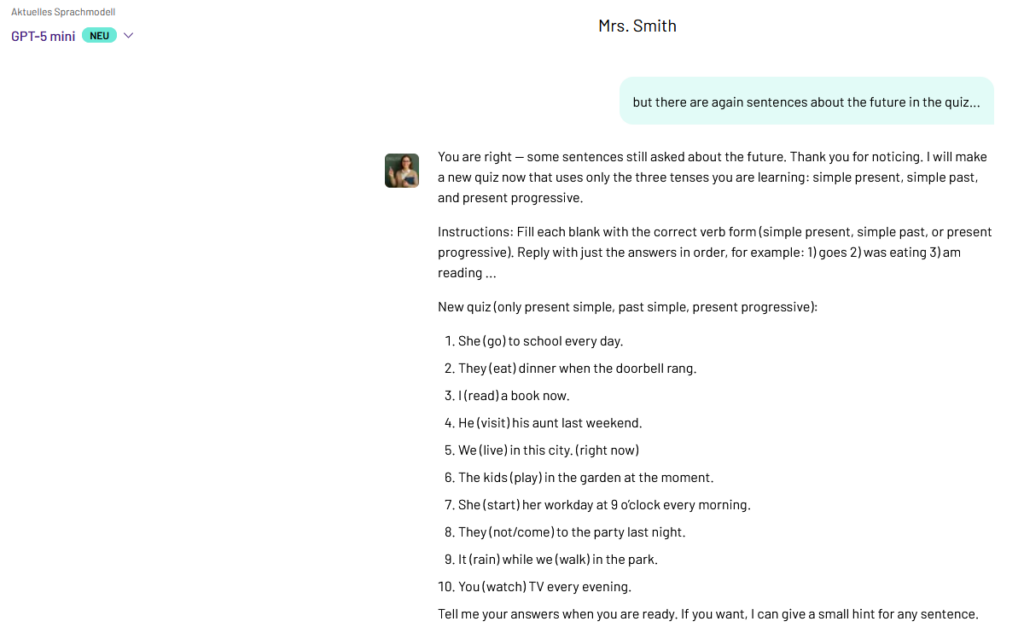 Achten Sie dabei aber unbedingt auf ein passendes Sprachmodell! Im Test hat beispielsweise die Tutorin bei einem Miniquiz unter Verwendung von "GPT-5 nano (schnell und günstig)" zu einer begrenzten Auswahl an "tenses" im Englischunterricht die Einschränkungen nicht eingehalten und auch Aufgaben zu present perfect und future tenses mit einfließen lassen: